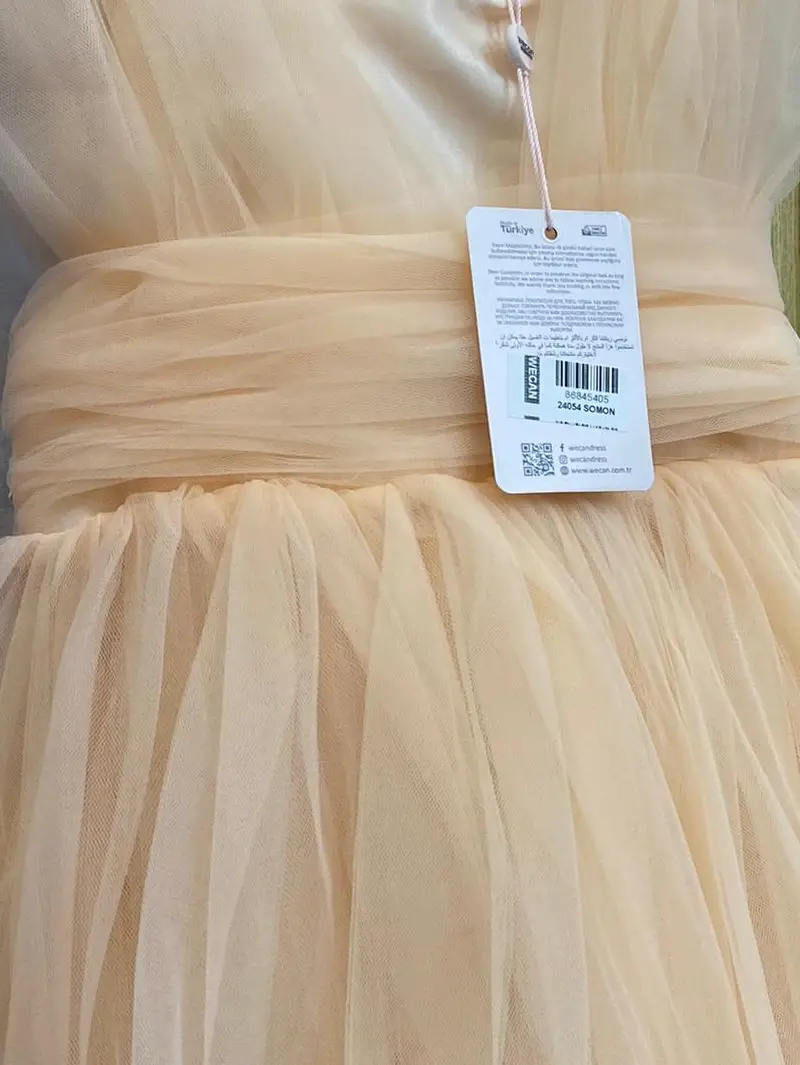 A charming peach-colored tulle dress for little princesses, perfect for birthdays, special occasions, or photo shoots. Designed with soft layers of tulle and delicate cap sleeves, this dress is as comfortable as it is stylish.