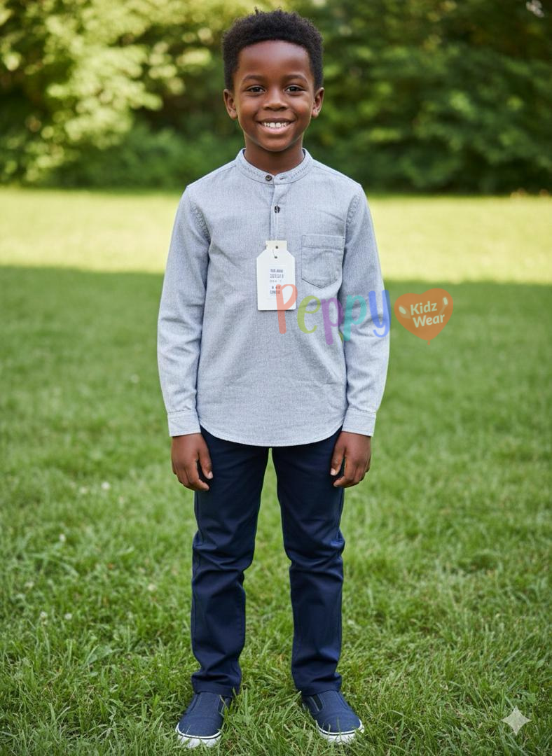 The Peppy Kidz Smart Classic Set is a stylish and clean two-piece outfit designed for boys who want a modern, polished look. This combination of a crisp shirt and dark trousers is perfect for parents in Kampala looking for a sophisticated yet simple formal outfit.