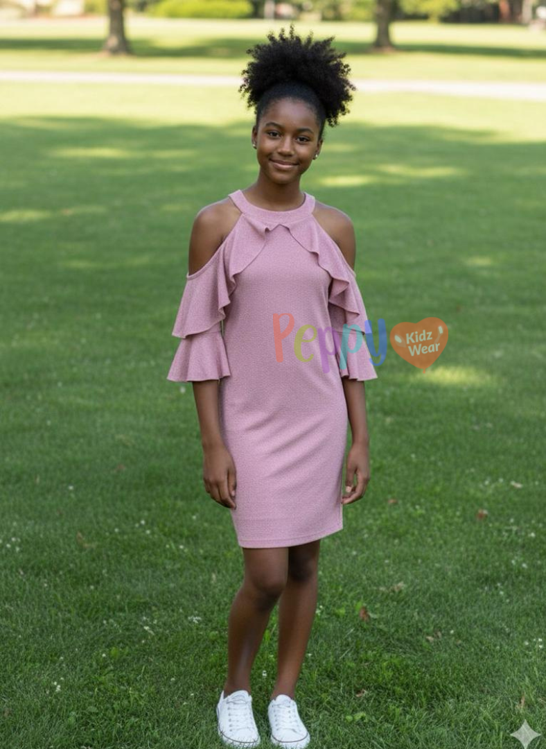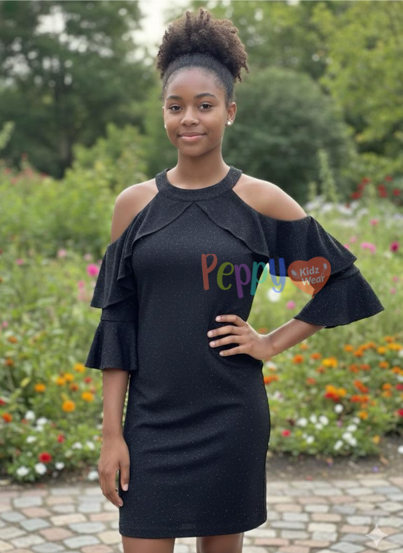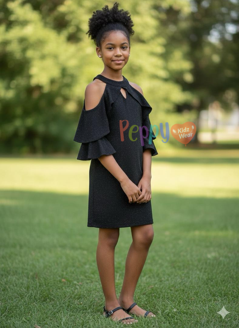 A graceful and elegant dress designed to give young girls a confident, stylish look. The Midnight Ruffle Cold-Shoulder Dress blends classic color with playful ruffle details, making it perfect for both special occasions and smart casual wear.