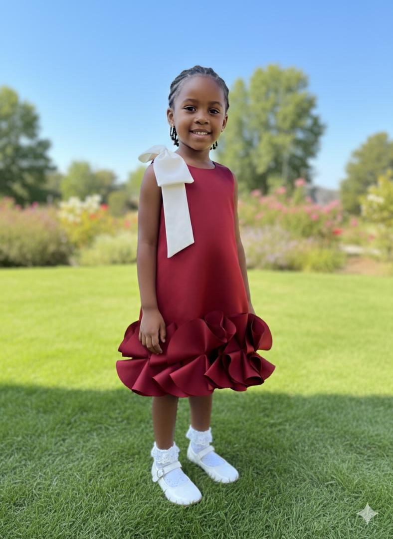 Let your child stand out in the elegant Ruby Radiance Party Dress, a masterpiece designed to make every event special. This vibrant red dress features a soft satin underlay with layers of flowy tulle for a voluminous, princess-like silhouette.