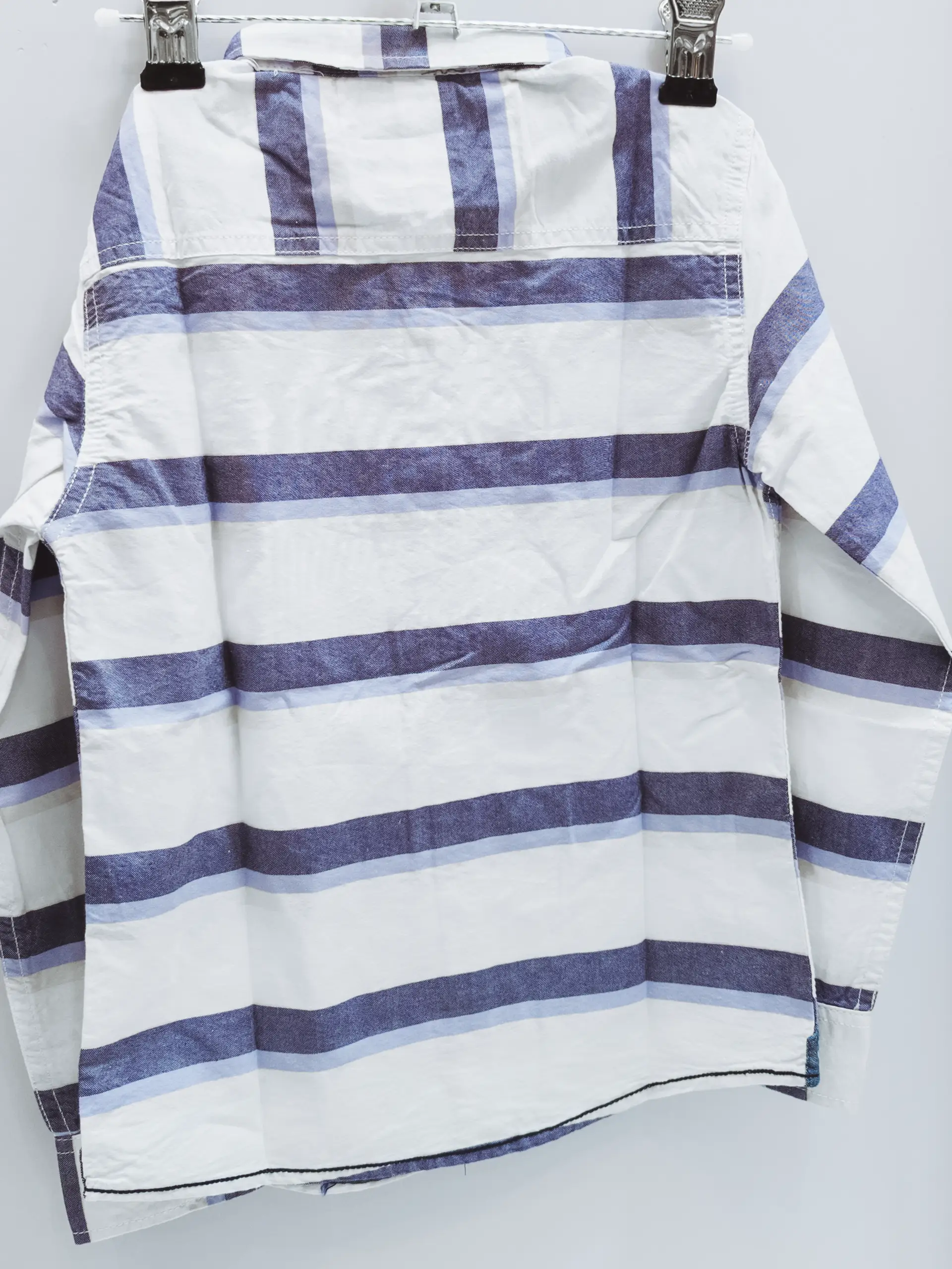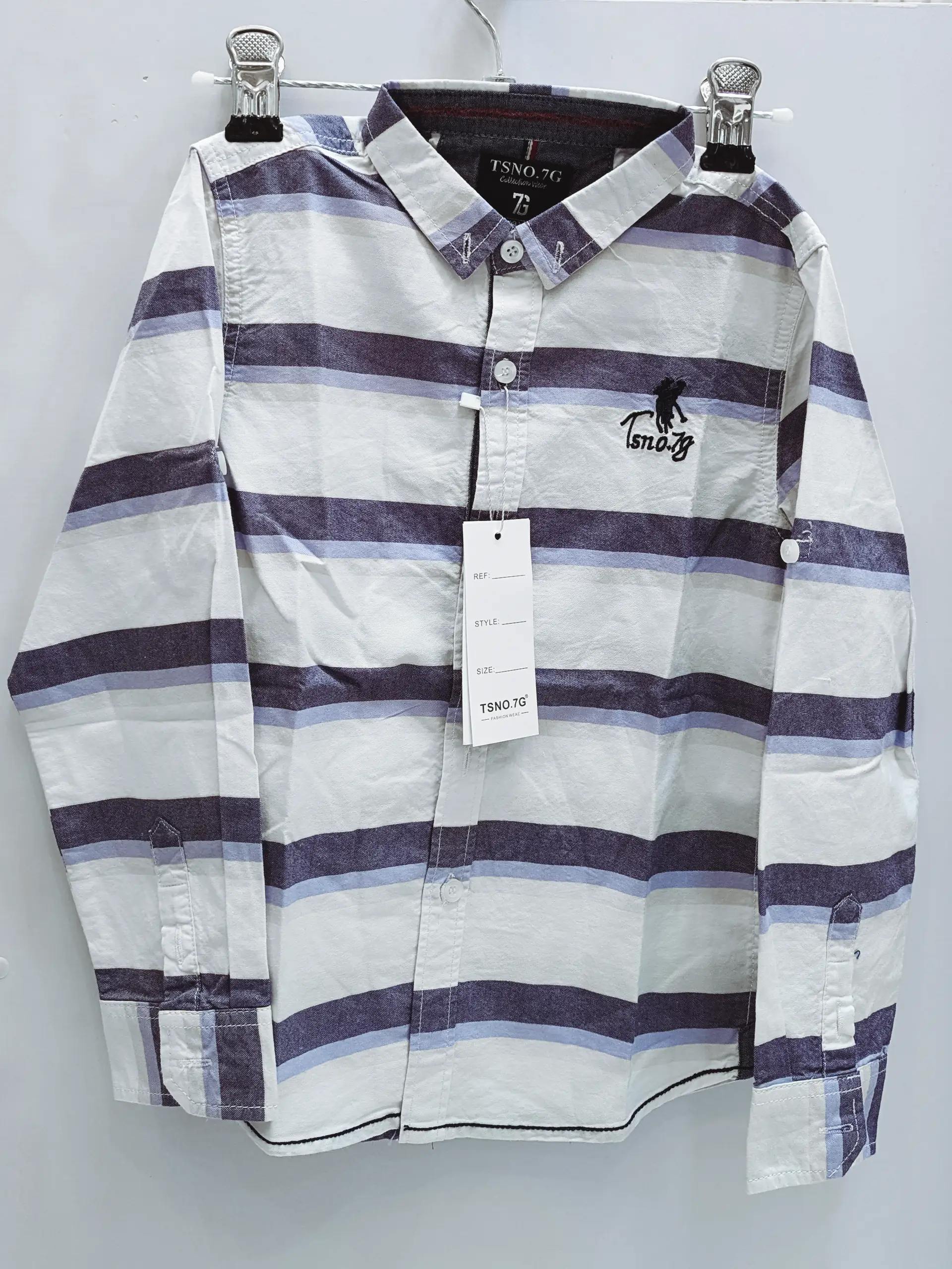 Stylish striped full-sleeve shirt featuring white and purple tones, a button-down design, and a classy embroidered logo. Ideal for casual outings or smart occasions for boys.
