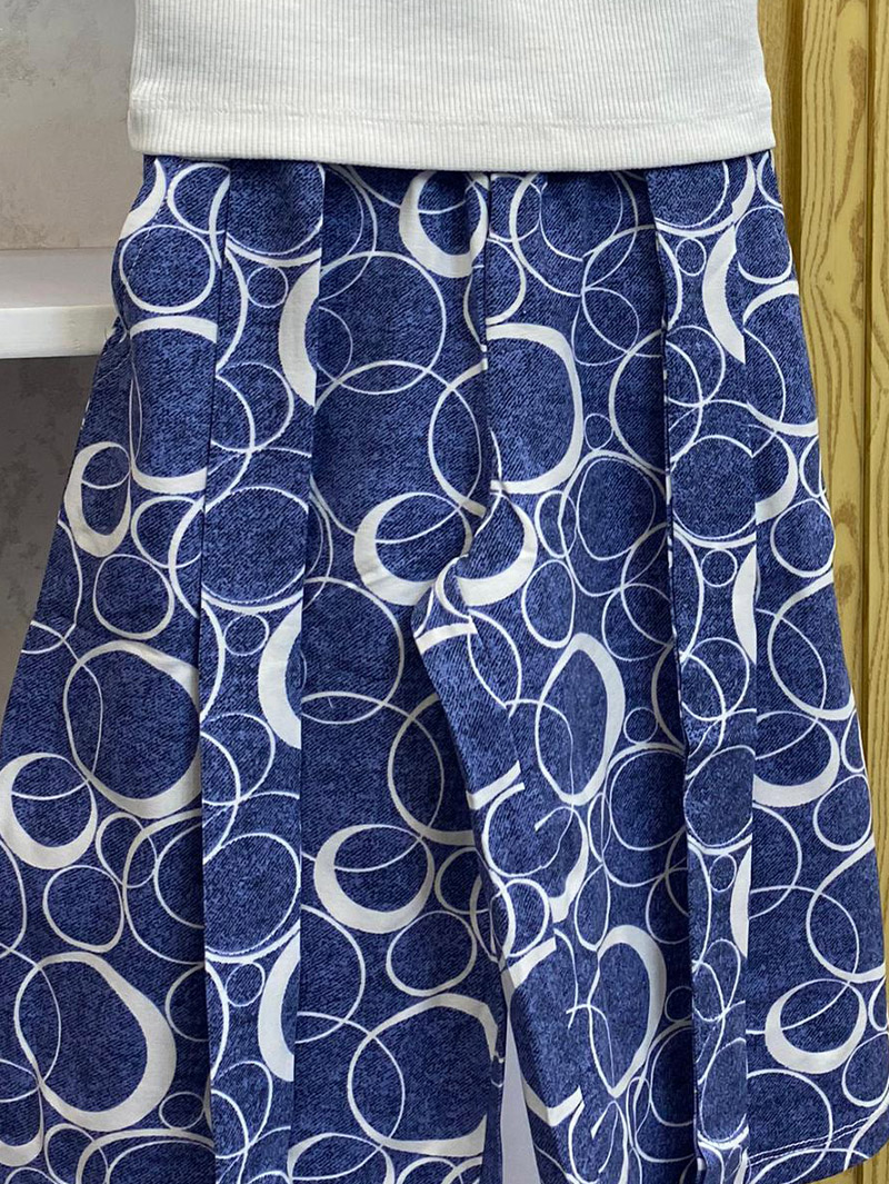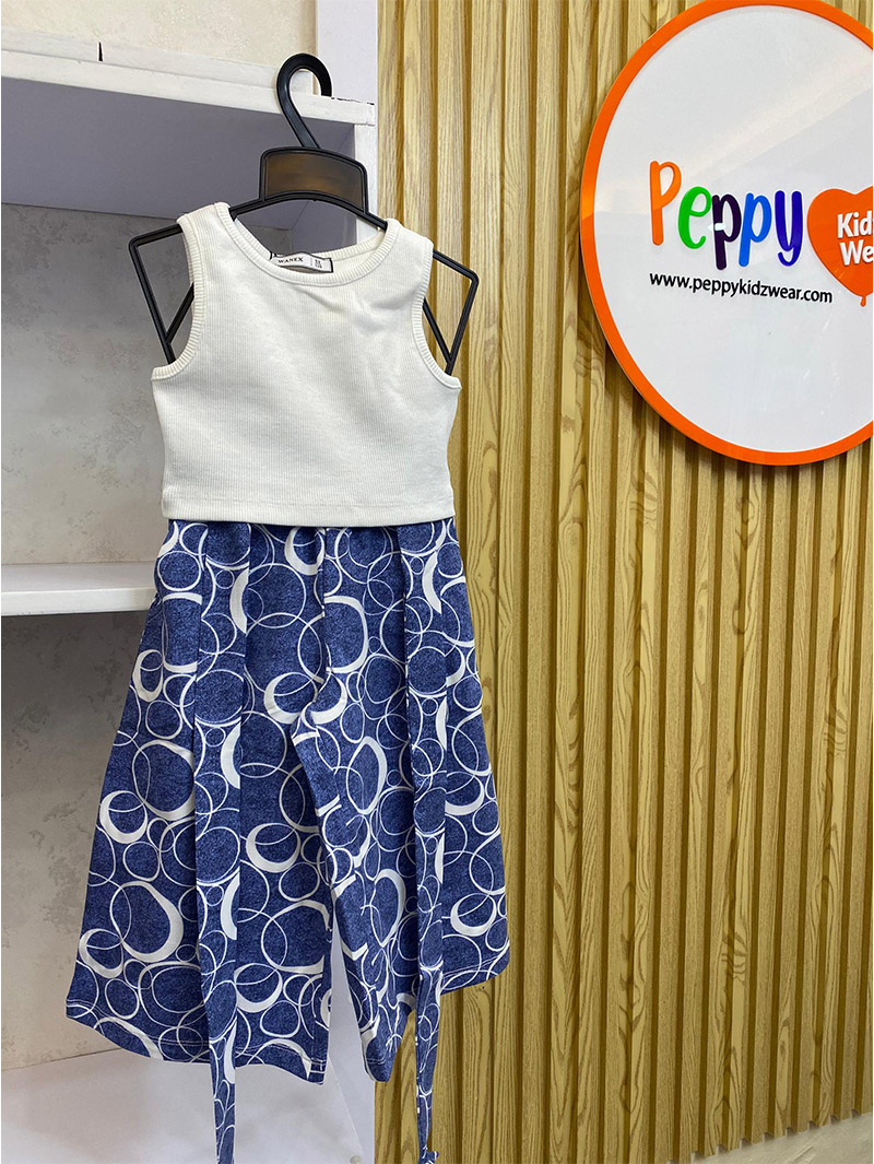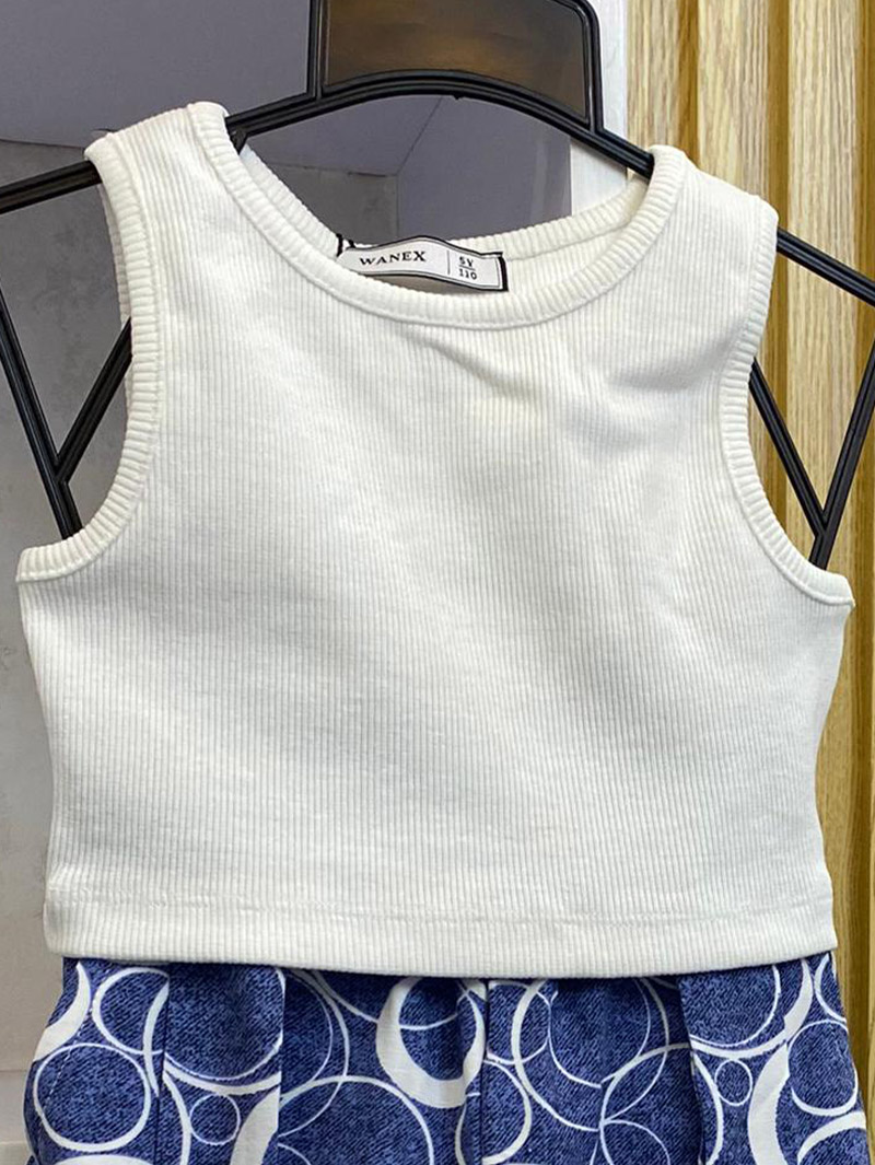 This chic and versatile outfit is perfect for girls who love comfort and style. The set includes a sleeveless white ribbed tank top made from breathable fabric, ensuring ease during warm days. The accompanying culottes are designed with an eye-catching blue and white circular abstract pattern, featuring a loose and flowy fit for unrestricted movement. The culottes include stylish tie details, adding a modern touch. Perfect for day trips, casual gatherings, or summer adventures, this outfit combines comfort with effortless style.
